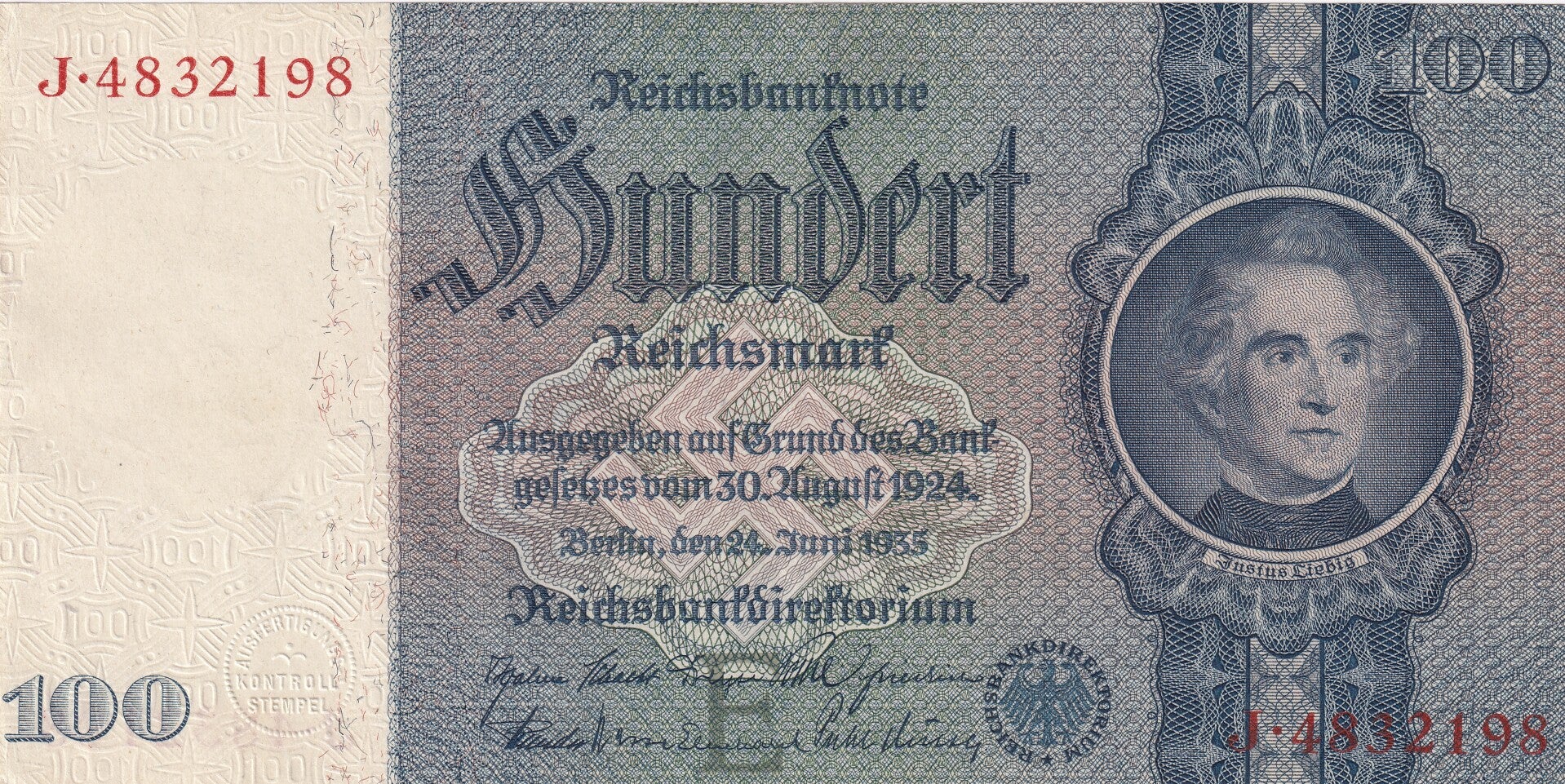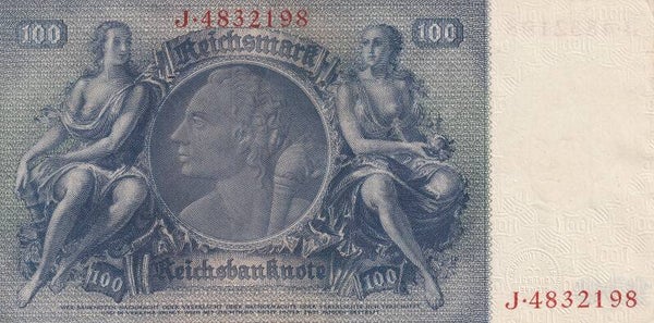 1935 Germany 100 Mark Reichsbanknote – Weimar Republic – Classical Allegory – VF Condition