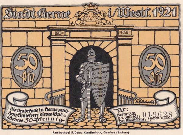 1921 German Notgeld 50 Pfennig note was issued by the City of Kerne (Stadt Kerne), Westphalia, during the profound economic disruption following World War I. With official Reich coinage in short supply, German municipalities produced Notgeld (emergency money) to maintain local trade—often commissioning richly illustrated designs that blended history, morality, and regional identity.