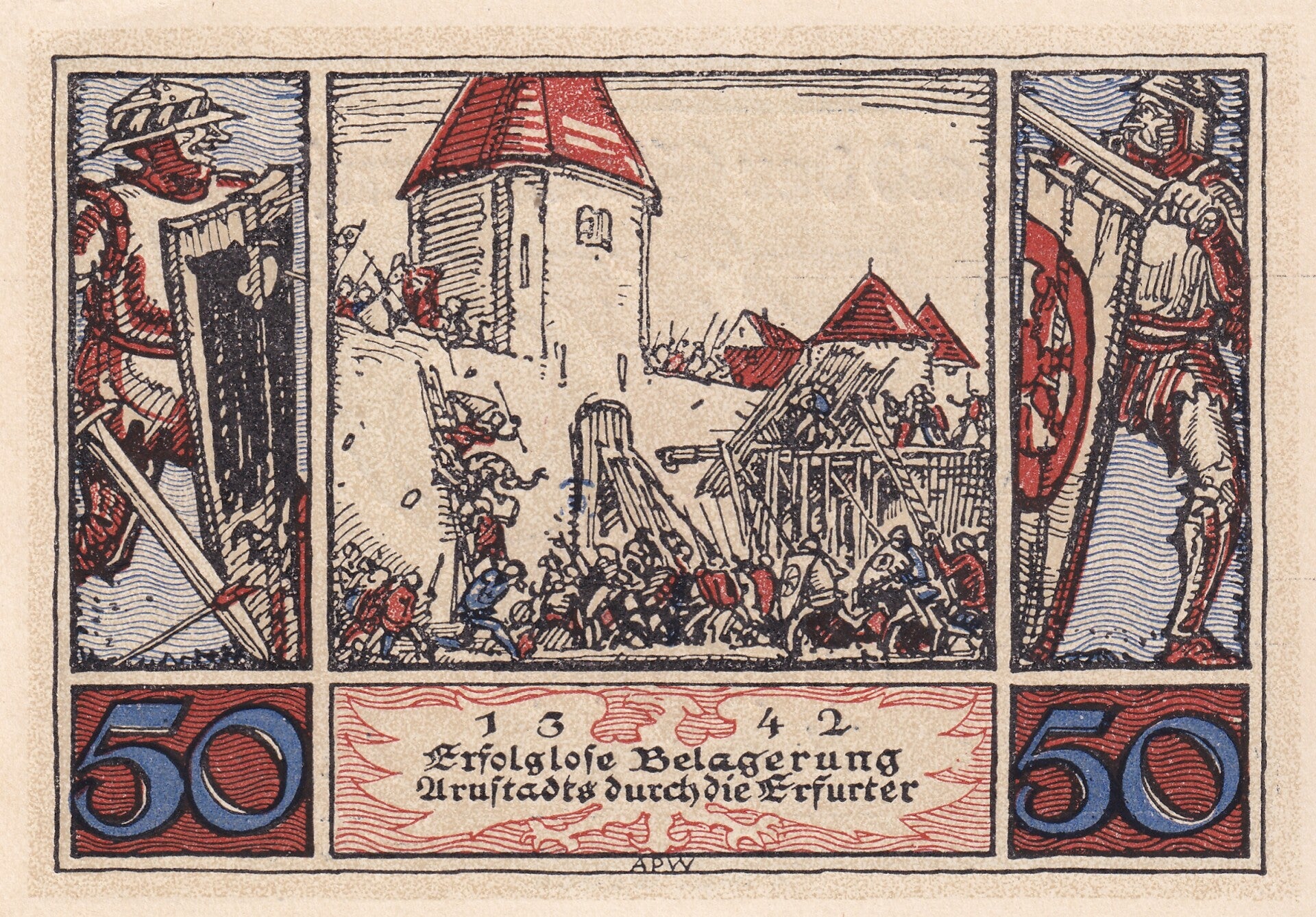 1921 German Notgeld 50 Pfennig note was issued by the City of Arnstadt (Stadt Arnstadt), Thuringia, during the post–World War I currency shortage that led many German municipalities to produce Notgeld (emergency money) for local circulation. Arnstadt’s issues are especially admired for their bold historical themes and strong graphic storytelling.
