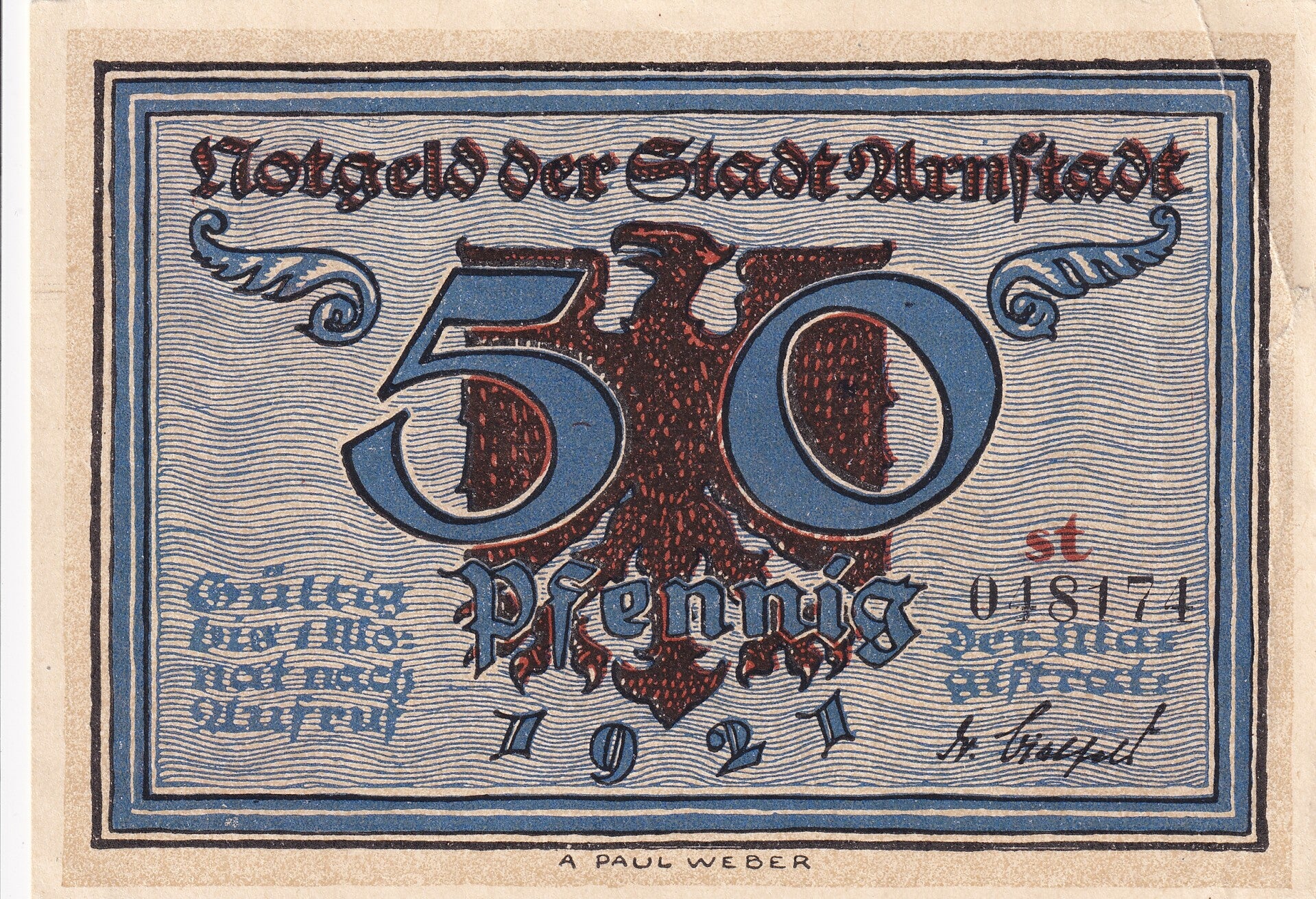 The obverse displays a bold “50 Pfennig” denomination set over a stylized imperial eagle, surrounded by intricate line work in blue and red tones. The inscription “Notgeld der Stadt Arnstadt” clearly identifies the issuing municipality, while serial numbering and official signatures authenticate its use as emergency currency in 1921.