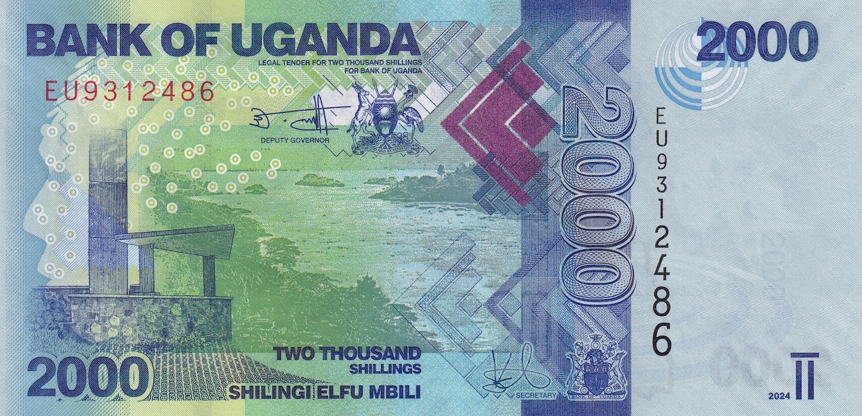 2024 Uganda 2000 Shillings banknote, issued by the Bank of Uganda, is a striking modern African banknote showcasing Uganda’s natural heritage, geography, and advanced security printing. This denomination forms part of Uganda’s contemporary polymer-style design series, highly regarded for both artistic quality and durability.