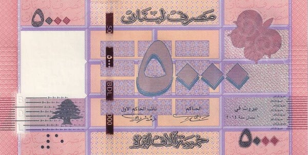 The obverse displays “Banque du Liban” in French and Arabic, along with a detailed lattice of guilloché patterns and denomination numerals in all corners. The reverse continues the geometric motif while highlighting the cedar emblem, micro-text, and color-shifting inks that enhance anti-counterfeiting protection.
