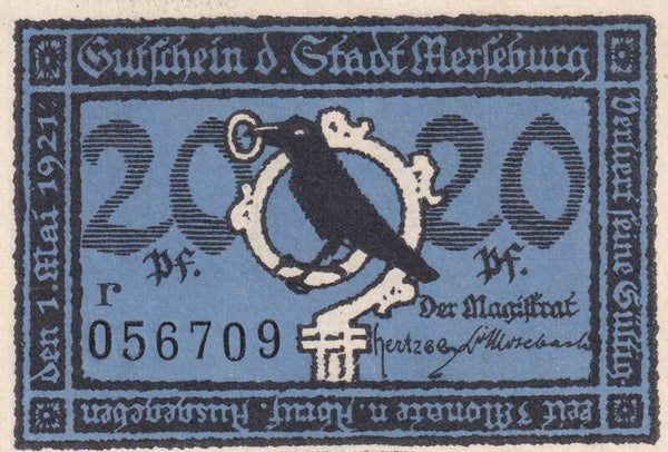 The reverse carries the inscription “Gutschein der Stadt Merseburg” (Voucher of the City of Merseburg) and prominently displays the city’s recurring raven motif perched on a ring, a powerful symbol of local identity. Additional features include an official serial number, municipal authorization “Der Magistrat”, and the signature of the city treasurer. The note was printed by Gebrüder Parcus of Munich, one of Germany’s leading security printers of the period.