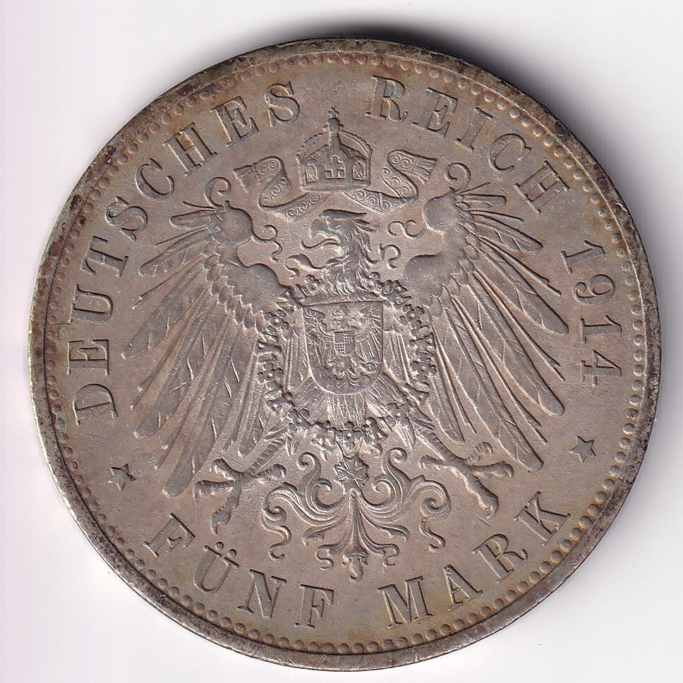 This coin was struck in the same year World War I began, making 1914-dated 5 Mark pieces historically significant. Large silver crowns like this were widely circulated, but many were later melted, making attractive original examples increasingly desirable.