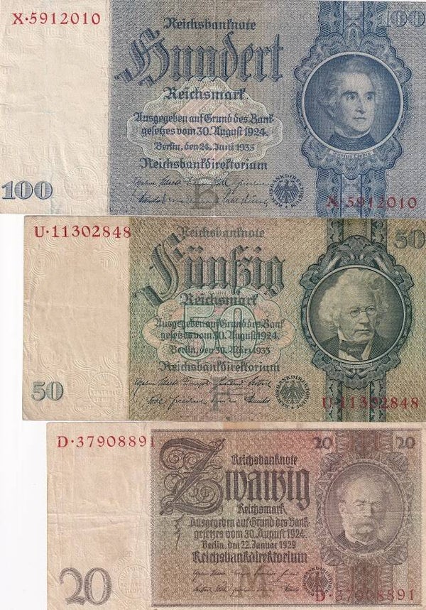 This original four-note Germany Reichsbanknote set represents the stabilized currency period following the hyperinflation crisis of the early 1920s. Issued under the authority of the Reichsbank between 1929 and 1935, these notes are among the most recognizable and historically significant banknotes of the Weimar Republic era.