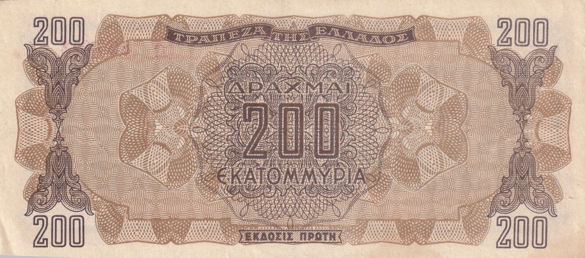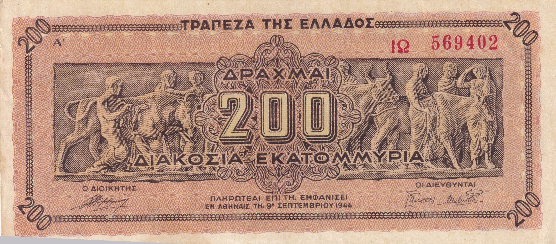 Greece 1944 200,000,000 Drachmai Banknote – WWII Hyperinflation – Bank of Greece - F