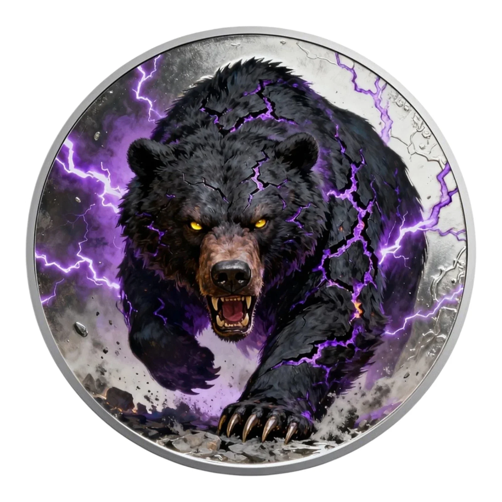 The obverse showcases a fierce black bear charging forward through a storm of crackling purple lightning. Striking yellow eyes, razor-sharp claws, and glowing fissures across the bear’s body create an electrifying, high-contrast design. The dynamic background adds depth and motion, making this piece visually explosive and display-worthy.