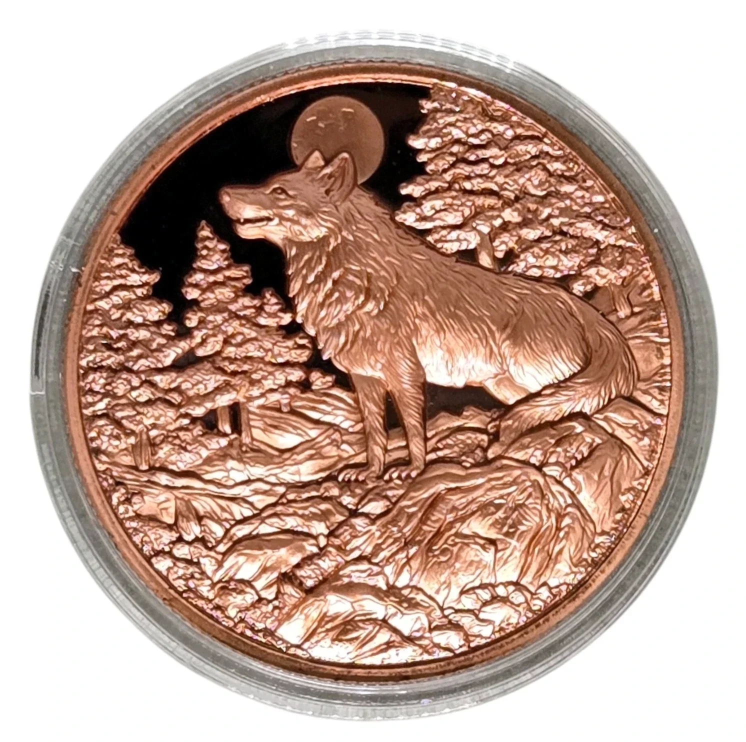 The obverse showcases a majestic wolf standing alert atop rugged rock formations beneath a glowing full moon. Surrounded by snow-covered pine trees and a serene forest backdrop, the high-relief engraving captures intricate fur texture, layered terrain detail, and deep contrast between the polished copper wolf and the darkened night sky. The moonlit setting adds dramatic depth and atmosphere, making this piece a standout display round.