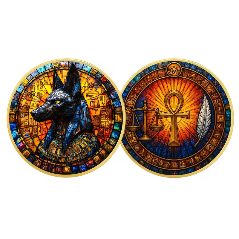 Anubis Egyptian Stained Glass Art Round – Ankh & Scales of Ma’at Alloy Fantasy Coin 40mm
