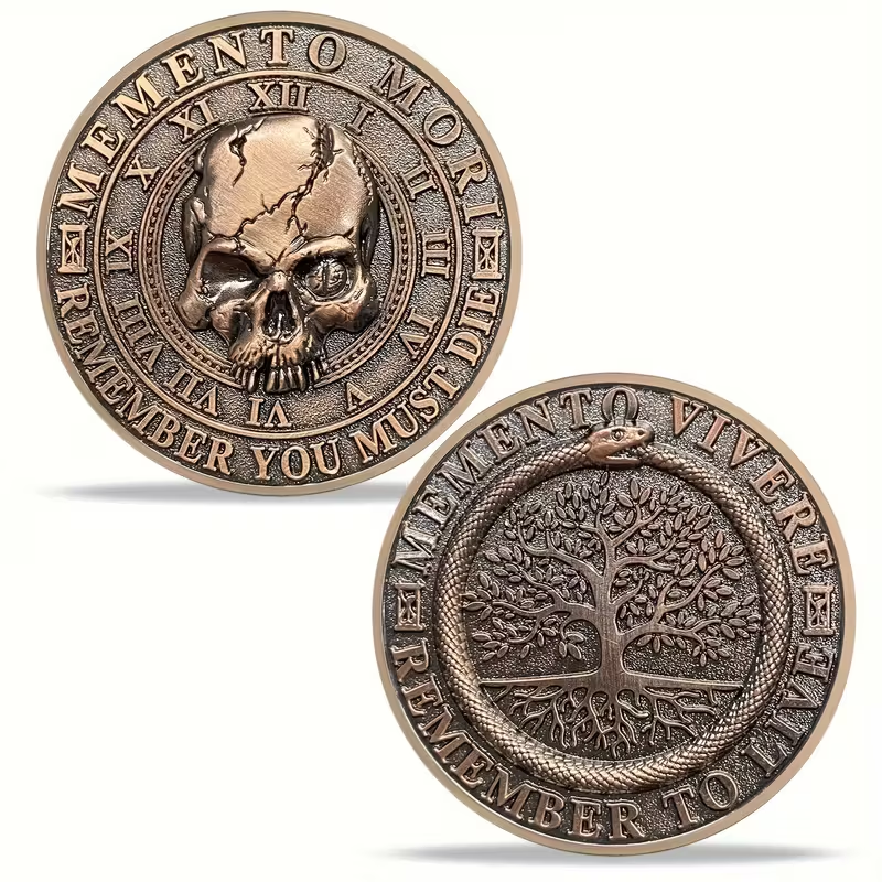This striking Memento Mori & Memento Vivere Art Round is crafted in durable alloy with an antique silver-bronze finish, featuring powerful symbolism inspired by classical philosophy and timeless Latin wisdom.
