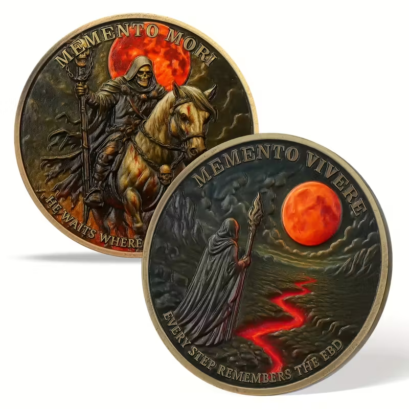 This dramatic Memento Mori / Memento Vivere Art Round is crafted in durable alloy with a gold-tone rim and measures approximately 40mm (1.57 inches) in diameter. Featuring cinematic high-detail artwork, this collectible medallion captures the timeless symbolism of mortality and reflection.